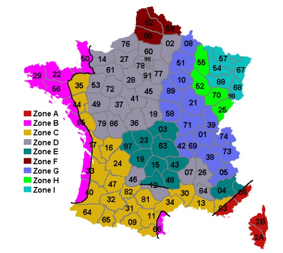 Lorsque l’on parle de température extérieure, on fait référence à la température extérieure de base, qui est représentative des cas les plus froids que l’on peut rencontrer dans chaque département. Bien que cette température ne soit que rarement atteinte, il est nécessaire que la pompe à chaleur soit en mesure de fonctionner correctement si le cas se présentait. Pour déterminer cette température, il faut premièrement voir dans quelle zone on se situe (de A à I).