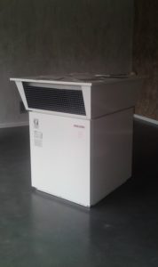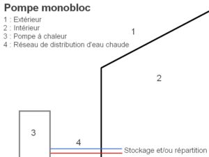 Sur une disposition monobloc, évaporateur et condenseur sont situés dans la carrosserie de la machine, hors du logement. Dans ce cas là, c’est l’eau qui circule dans le réseau, et qui vient ensuite alimenter les différents éléments du système de chauffage.