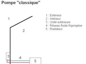 Avec une disposition dite « classique », c’est le fluide frigorigène qui voyage dans le réseau. L’évaporateur est situé hors du bâtiment (dans l’unité extérieure). En revanche, le condenseur se situe dans l’habitation. Ce condenseur peut être en contact avec de l’eau (cas d’un ballon d’eau chaude), ou directement avec de l’air (cas d’un radiateur/convecteur, qui chauffe l’air).